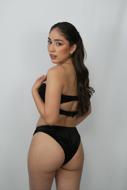 En el frente, incorpora una tira decorativa que resalta las curvas de manera sutil, mientras que los aros frontales brindan un detalle visual único, creando un equilibrio entre minimalismo y sensualidad.