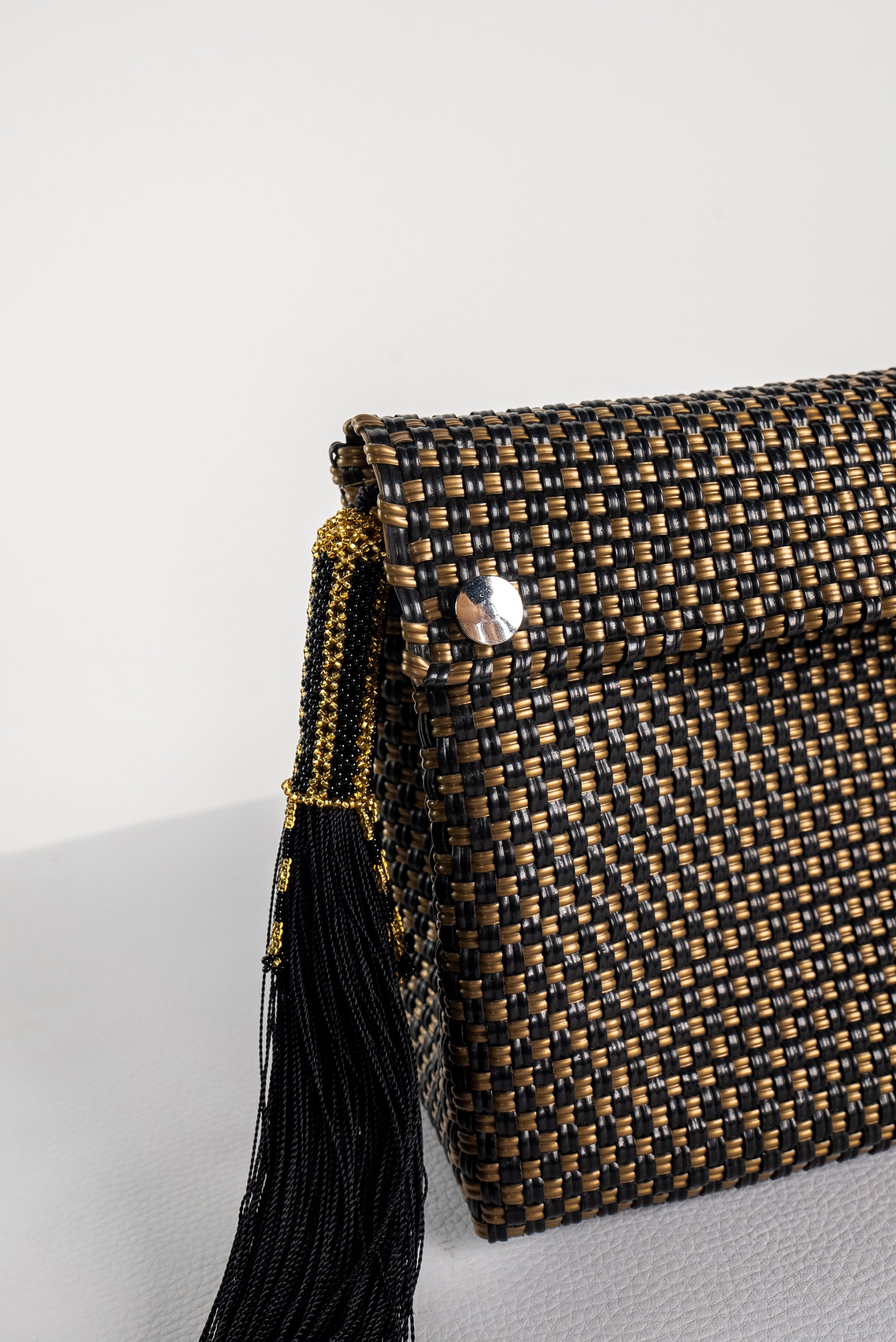 Este exclusivo clutch artesanal combina tradición y estilo contemporáneo en un diseño único. Elaborado a mano con fibras sintéticas resistentes, presenta un patrón trenzado en vibrantes tonos de azul, verde y fucsia que evocan la riqueza de la artesanía mexicana. Su práctico cierre de broches metálicos asegura tus pertenencias mientras mantiene su estética elegante.