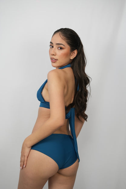 El bikini Mazeli es una fusión de estilo y sofisticación. Su top halter con escote profundo y banda ancha ofrece un ajuste cómodo y favorecedor. El calzón bicolor, con paneles laterales en contraste y detalles decorativos, resalta la silueta con un diseño moderno y elegante.