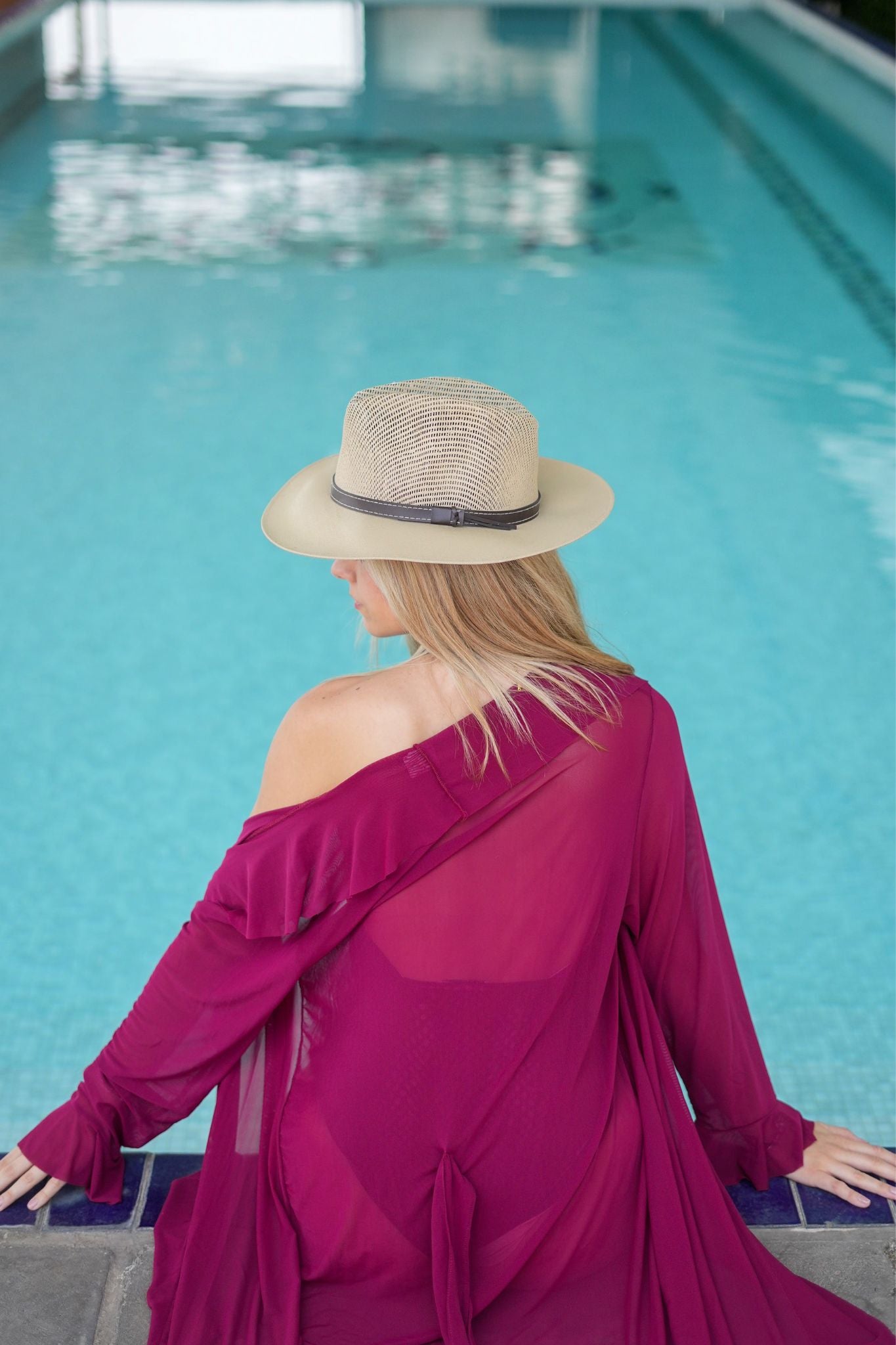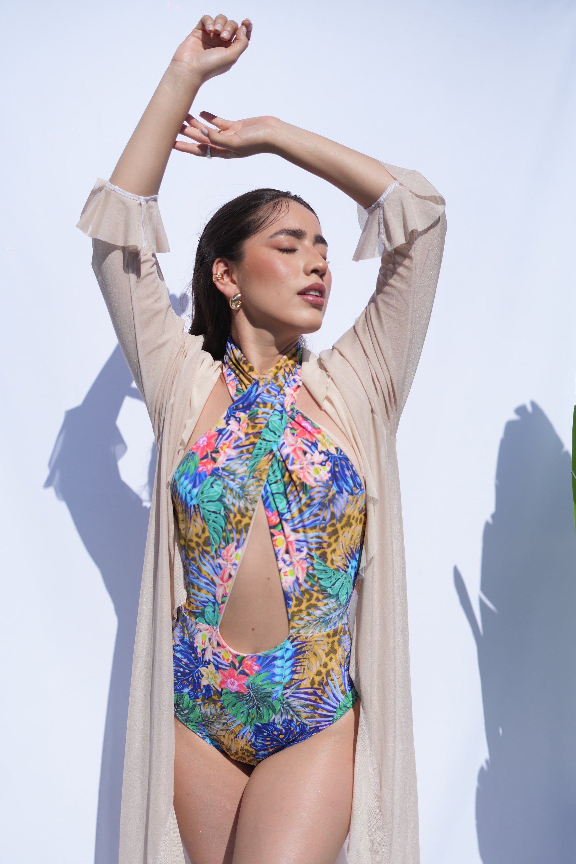 Eleva tu estilo playero con esta bata ligera en tono beige, negro, rosa, vino y un diseño único en print azul diseñada para brindar comodidad y sofisticación. Confeccionada en una tela translúcida y fluida, es perfecta para complementar tus looks de playa o piscina. Su diseño incluye mangas largas con delicados volantes en los puños, que añaden un toque femenino y romántico.