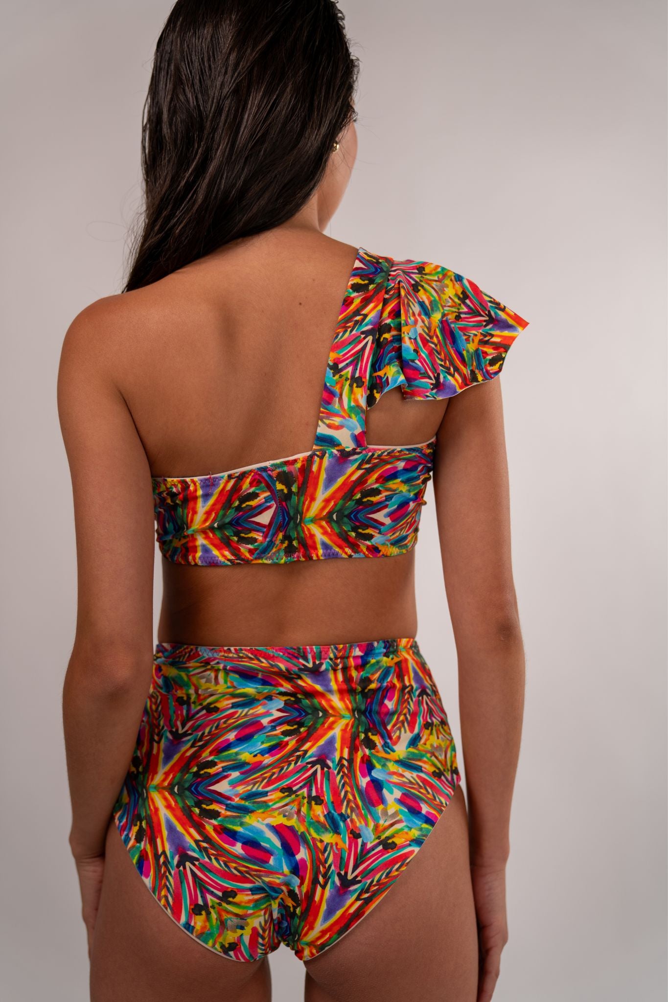El Top Santorini es una pieza sofisticada y versátil que destaca por su diseño asimétrico. Su único tirante, adornado con delicados olanes, aporta fluidez y un toque juguetón que realza la silueta con elegancia.